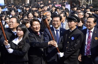 이날 이 시장은 김동찬 시의회 의장과 시의원들, 장휘국 시 교육감, 5·18단체, 4·19단체, 3·15단체 대표, 공무원 등 70여명과 함께 대구를 찾아 두류공원의 2·28민주운동 기념탑에 헌화하고 기념식에 참석한 뒤 이어 열린 재현행사에 참여했다.
