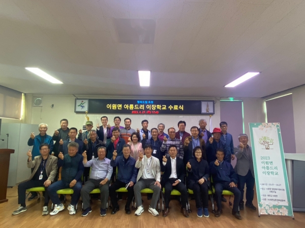 이장이 중심이 되어 주민들과 함께 마을 활동을 하고 주민들의 아름드리 버팀목이 되자는 의미로 명칭을 붙인 ‘아름드리 이장학교’는 지난 3월 7일 개강해 4월 27일까지 선진지 견학을 포함해 8회차의 과정을 마치고 이원면 28개 마을 이장들을 비롯해 관계자 등 50여명이 참석한 가운데 수료자를 축하하고 격려하는 뜻깊은 자리를 가졌다.