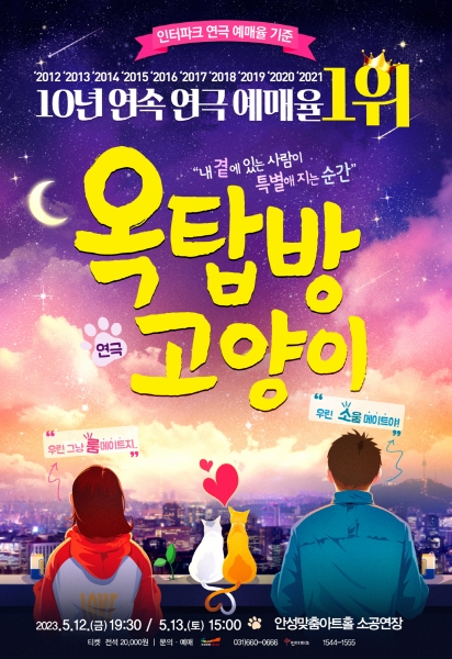 ‘옥탑방 고양이’는 초연부터 10년 연속 인터파크 예매율 1위를 차지하며 대학로 대표 데이트 공연으로 자리매김한 연극이다.