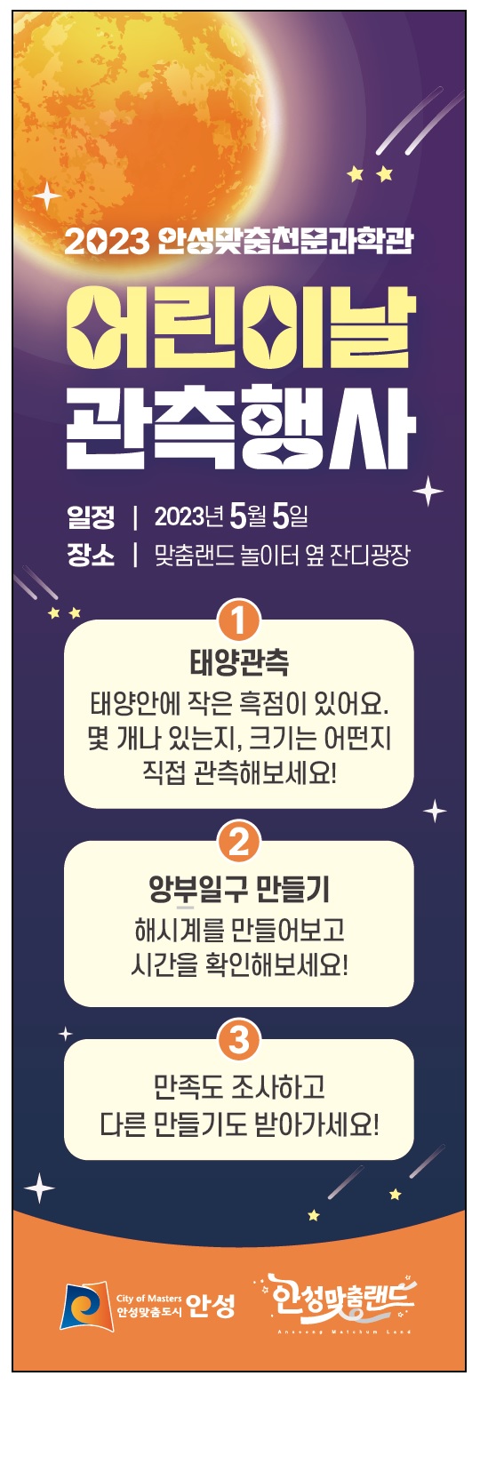 5월 5일 오후 2시-오후 5시40분 동안 안성맞춤랜드 내 잔디광장에서 무료 태양관측활동 및 다양한 천문공작품 만들기를 계획 중이다.