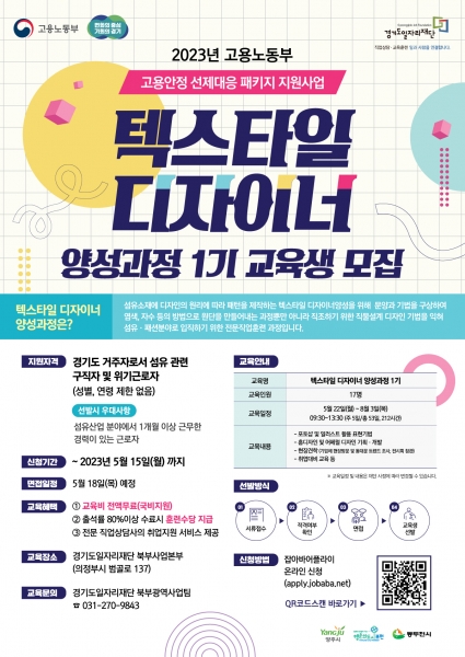 [충청뉴스큐] 경기도와 경기도일자리재단이 경기북부 섬유산업 활성화와 일자리 창출을 위해 고부가가치 상품 개발인력을 양성하는 ‘텍스타일 디자이너 양성 과정’ 1기 교육생을 모집한다.