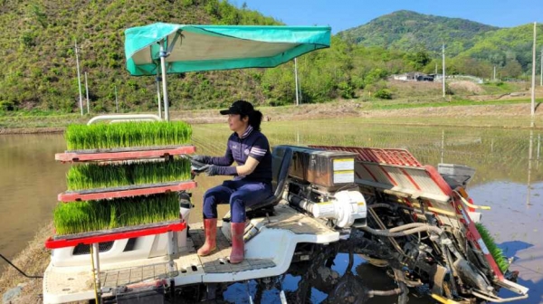청산면 만월리 김기문, 김인자 부부는 5월 1일부터 3일간 만월리 18,000여평 논에 첫 모내기 작업을 한다.