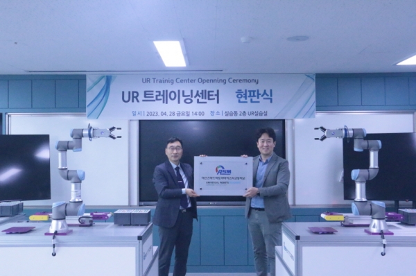 [충청뉴스큐] 아산스마트팩토리마이스터고등학교는 4월 28일 유니버설로봇 인증교육센터 현판식을 진행했다.