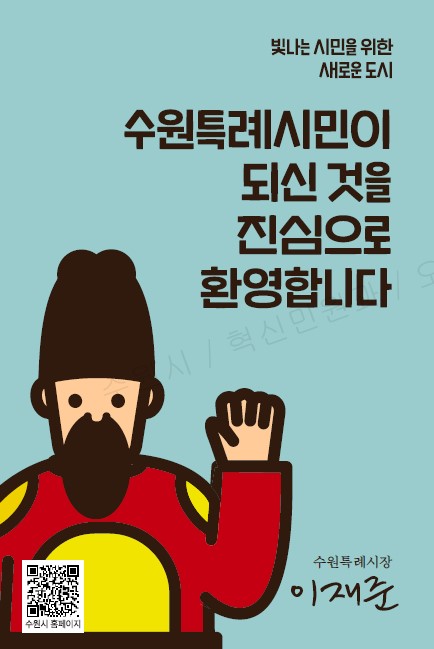 수원시 도시디자인단이 수원의 대표 이미지인 수원화성과 정조대왕 캐릭터를 활용해 전입시민 안내서와 ‘환영카드’를 디자인했다.