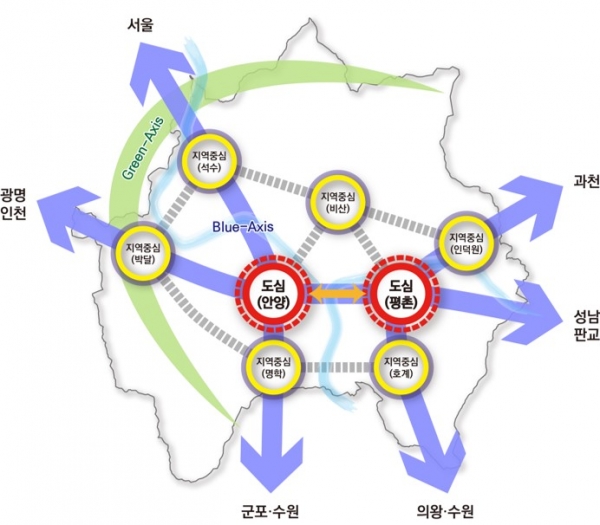 도시공간구조는 만안구와 동안구의 도심 위상 강화 및 연계를 통한 안양시의 중심 기능 수행, 도심기능의 지원 및 보완을 위한 지역 중심별 특화 기능 배분 등 대내외적 여건 변화와 주변 지역과의 연계성 등을 고려해 2 도심 6 지역 중심으로 설정하고 도시 간의 성장동력의 연계를 도모하기 위해 도시발전 축은 남북 2축, 동서 1축으로 설정했다.