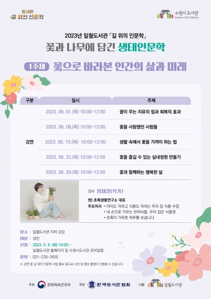 [충청뉴스큐] 수원시 일월도서관이 ‘2023년 길 위의 인문학 1주제-꽃으로 바라본 인간의 삶과 미래’ 참여자를 9일 오전 10시부터 선착순으로 모집한다.