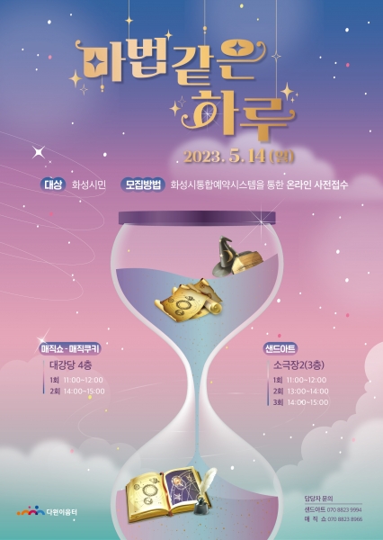 해당 공연은 화성시 관내 유아를 대상으로 총 5회‘매직쇼-매직쿠키’ 와 ‘샌드아트’ 운영될 예정이다.