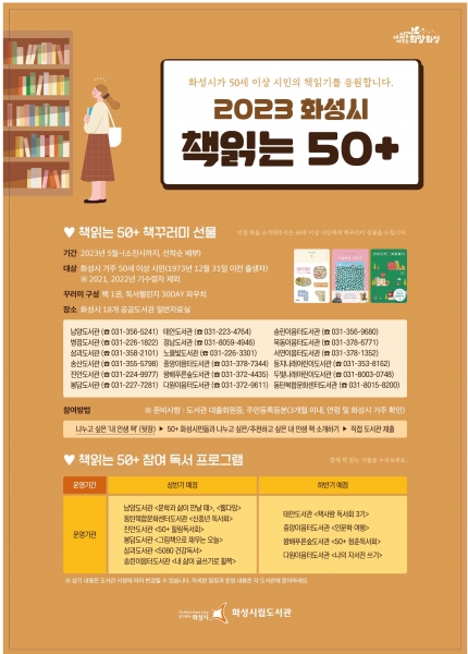 이병희 도서관정책과장은 “화성시민의 맞춤 독서 강화를 위해 시작한 책읽는 50+가 올해 3년 차를 맞이했다”며 “인생 전환기를 맞이하는 50+ 시민들이 독서를 통해 공감과 소통의 시간을 갖고 건강한 삶을 살 수 있길 응원한다”고 말했다.