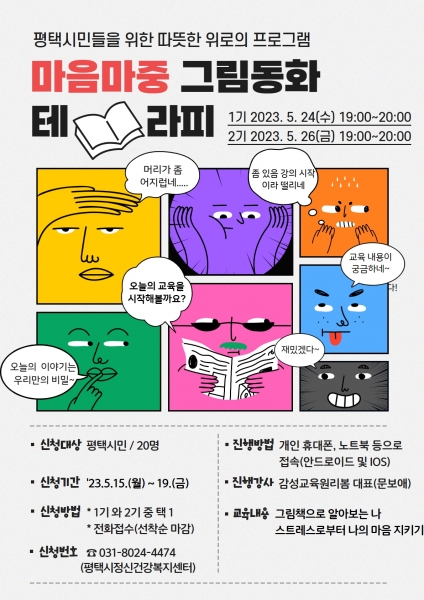 이번 프로그램은 그림책이 전하는 따뜻한 위로와 나를 돌아보는 어른을 위한 그림책 테라피로 딱딱해진 나의 마음 돌보기 당신의 마음은 안녕한가요? 그림책 일상 회복 처방전 등으로 진행할 예정인데, 참여를 원하는 평택시민은 평택시정신건강복지센터에 전화해 신청할 수 있다.
