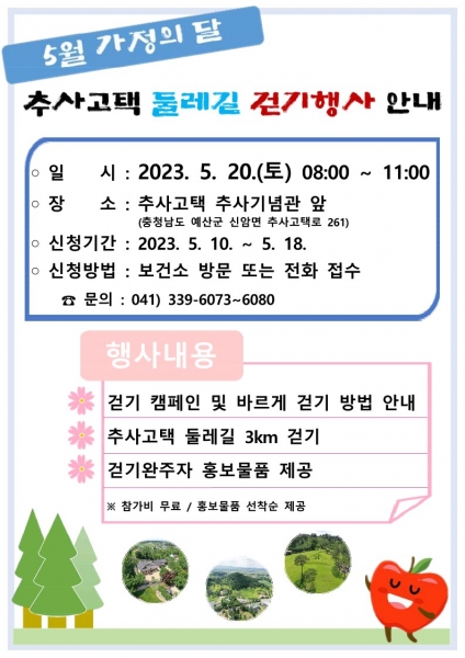 [충청뉴스큐] 예산군보건소는 오는 5월 20일 오전 8시 신암면 소재 추사 김정희 선생 고택 일원에서 둘레길 걷기 행사를 개최한다.