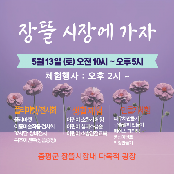 [충청뉴스큐] 증평군이 가정의 달 5월을 맞아 ‘시장에 가자’ 행사를 13일 증평장뜰시장 다목적광장에서 개최한다고 밝혔다.