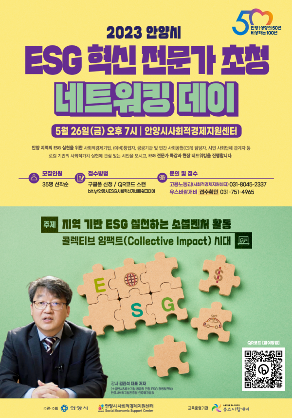 [충청뉴스큐] 안양시가 ESG 혁신전문가 초청해 특강 및 네트워킹데이를 오는 26일 오후 7시 동안구 평촌동의 안양시사회적경제지원센터에서 개최한다고 11일 밝혔다.