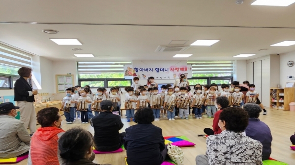 [충청뉴스큐] 지난 5월 8일 안성3동에 소재한 낙원어린이집 원생들과 학부모들은 지역의 어르신 20여명을 어린이집으로 초대해 아이들의 악기공연과 중식을 제공했다.