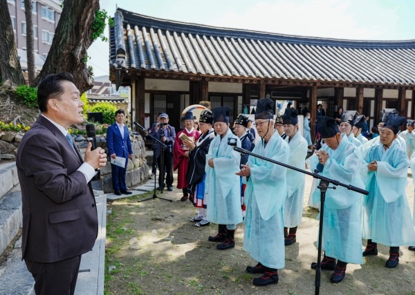 이어 이기도 회장이 중간정도 익은 술을 두 번째 잔으로 올리는 아헌관을, 김현광 대표가 숙성된 맑은 청주를 세 번째 잔으로 드리는 종헌관을 맡고 행례를 진행했다.