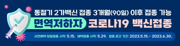 [충청뉴스큐] 평택시는 최근 방역 상황 및 백신의 효과성, 면역유지 기간 등을 고려해 ’23년 상반기 코로나19 고위험군 접종을 5월 15일부터 시작한다고 밝혔다.