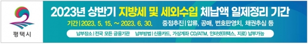 [충청뉴스큐] 평택시는 조세 정의 실현 및 지방재정의 건전성 확보를 위해 오는 6월 말까지를 ‘상반기 지방세·세외수입 체납액 일제정리기간’으로 정하고 체납액 징수에 전 행정력을 집중하기로 했다.
