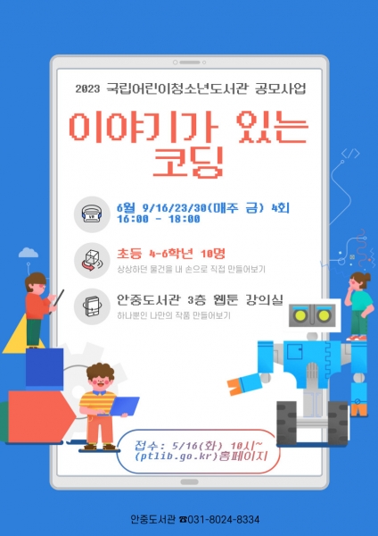 [충청뉴스큐] 평택시립안중도서관은 국립어린이청소년도서관이 주관하는 2023년 ‘이야기가 있는 코딩’ 공모사업에 2년 연속 선정됐다.