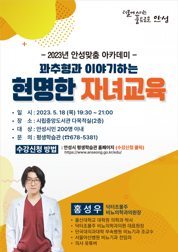 [충청뉴스큐] 안성시는 오는 5월 18일 저녁 7시 30분 시립중앙도서관 다목적실에서 안성맞춤아카데미 3회차 강연으로 꽈추형으로 잘 알려진 홍성우 조물주비뇨의학과원장을 초청해 ‘꽈추형과 이야기하는 현명한 자녀 성교육’이라는 주제로 강연을 펼칠 예정이다.