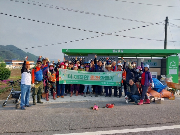 이날 청소에 참여한 주민들은 종천삼거리 부근 꽃잔디 동산 풀메기와 마을 곳곳에 버려진 생활쓰레기를 수거하고 깔끔미방의 재활용품을 분리수거 하는 등 깨끗한 여름을 맞이하기 위해 구슬땀을 흘렸다.