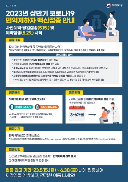 [충청뉴스큐] 이번 접종은 질병관리청의 ‘2023년 상반기 코로나19 고위험군 접종계획’에 따라 지난 동절기 추가접종 시 2가백신 접종을 완료한 사람 중 만 12세 이상 면역저하자와 의료진 상담을 통해 접종을 권고받은 만 65세 이상 고령층을 대상으로 실시한다.