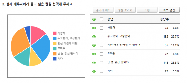 이 밖에 ‘기타’를 선택한 27명은 ‘당신이 있어 행복해’,‘함께 건강하게 살자’등의 말을 듣고 싶어 하는 것으로 나타났다.