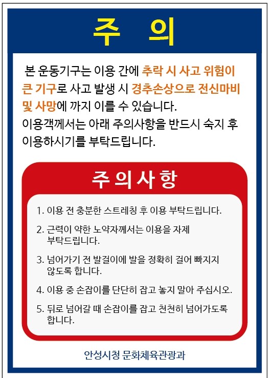 주의 안내문은 이용 전 충분한 스트레칭 후 이용할 것발 빠짐 우려에 따른 안전에 유의할 것이용 중 손잡이를 단단히 잡고 이용할 것바른 자세로 천천히 이용해 달라는 내용으로 구성됐다.