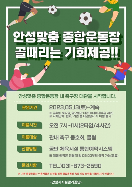 [충청뉴스큐] 안성시시설관리공단은 관내 축구 동호회, 클럽을 대상으로 안성맞춤종합운동장 축구장을 5월 13일부터 매주 주말 오전 에 한해 대관을 실시한다고 밝혔다.