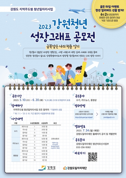 [충청뉴스큐] 강원도와 강원도일자리재단이 강원도 지역주도형 청년일자리사업 참여자를 대상으로 다음달 6월 20일까지 ‘2023 강원청년 성장그래프 공모전’을 공모한다.
