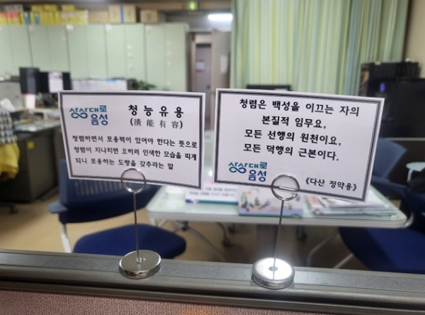 이번 시책의 일환으로 지난 1일부터 매월 청렴 문구를 선정해 책상 위에 놓고 자연스럽게 청렴 정신 및 몸가짐을 배우고 실천하는 자체 청렴시책을 특수시책으로 병행 추진함에 따라 청렴문화 조성에 적극 기여하고 있다.