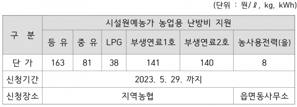 신청 기한은 5월 29일까지로 난방용 면세유는 지역농협에, 전기료는 주소지 읍면동 행정복지센터에 신청할 수 있다.