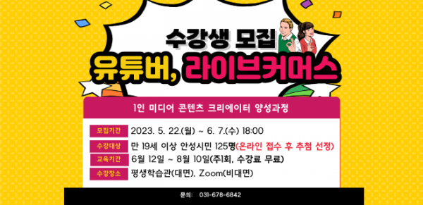 수강료는 전액 무료이며 교육내용은 영상 제작기획, 영상편집, 유튜브 채널 개설 및 관리, 유튜브 라이브 방송 실습 등으로 6월 12일부터 8월 10일까지 8주간 대면/비대면 방식으로 진행된다.