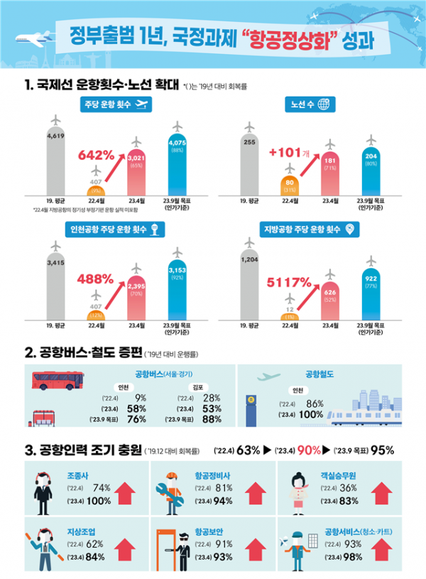 정부 출범 당시 국제선 운항 횟수는 주 407회 수준에 불과했으나, 지난 6월 국제선 조기 정상화 대책을 수립·추진한 결과, 1년간 국제선 운항 횟수는 642% 대폭 증가한 것으로 나타났다.