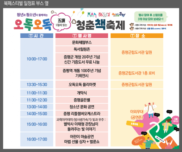 이번 축제는 청소년의 달을 맞이해 증평군립도서관과 증평군청소년수련관이 함께 주관했으며 ‘문화가 있는 도서관, 우리가 만드는 도서관 문화 축제’라는 주제로 청년과 청소년이 주체가 되는 다양한 문화 체험행사를 운영했다.