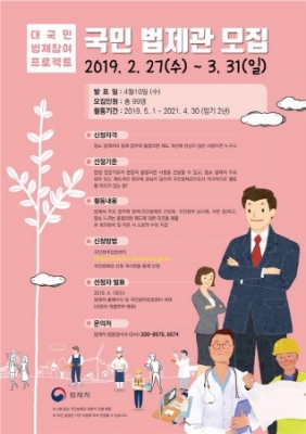 신청은 31일까지 국민참여입법센터() 국민법제관 신청 게시판을 통해 할 수 있으며, 선정자는 4월 10일에 법제처 홈페이지와 국민참여입법센터를 통해 발표되고, 선정자에게는 개별 연락할 예정이다.