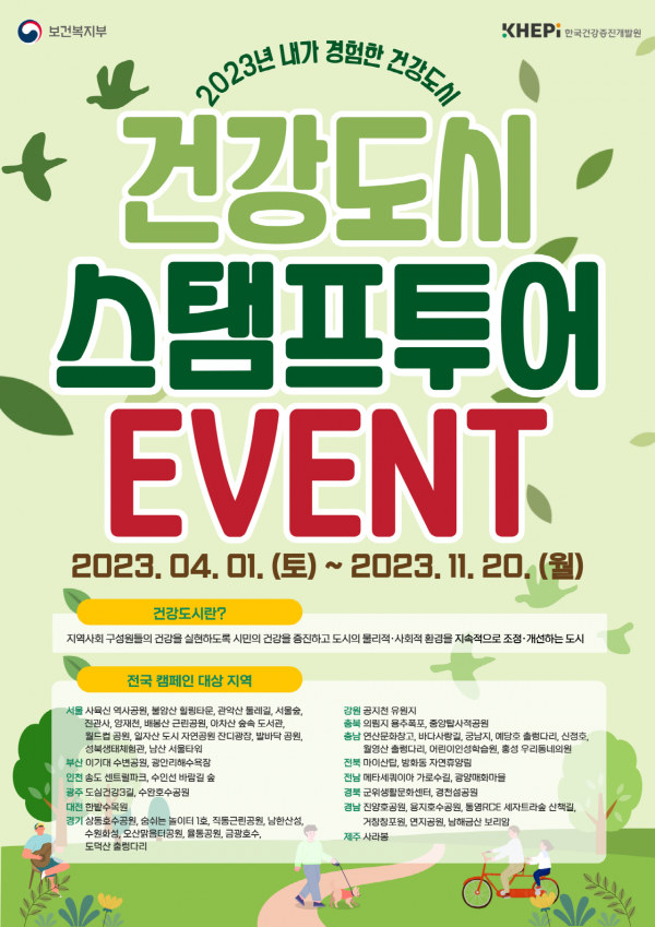 가까운 건강도시 조성 장소를 자주 방문해 동일한 도장을 모으는 ‘내가 살고 있는 건강도시’와 전국의 건강도시 조성 장소를 ‘여러곳’ 방문해 다양한 도장을 모으는 ‘내가 가본 건강도시’ 두가지 이벤트로 진행 된다.
