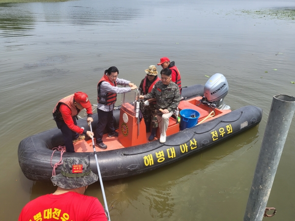 한편 해병대 아산전우회에서는 오는 6월15일까지 주 1~2회 수중 수초 제거와 수거, 쓰레기 및 폐사 어류 수거 등 집중 환경정화 활동을 할 예정이다.
