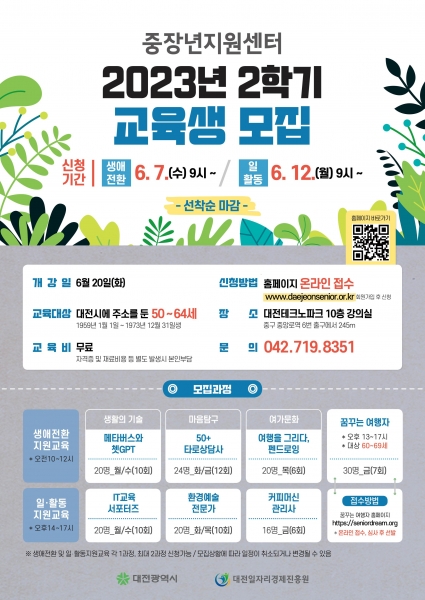 [충청뉴스큐] 대전시가 지원하고 대전일자리경제진흥원이 운영하는 중장년지원센터가 다음달 6월 7일부터‘2023년 2학기 교육과정’ 교육생을 모집한다고 22일 밝혔다.