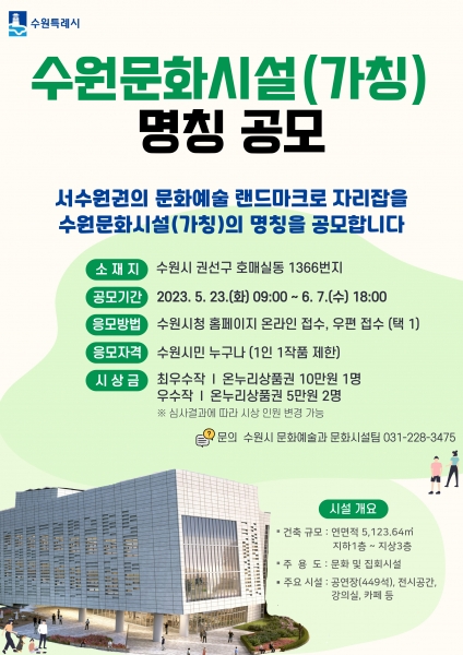 수원시 관계자는 “수원문화시설은 서수원권 문화예술 랜드마크로 자리매김할 것”이라며 “부르기 쉬우면서도 친근감 있는 참신한 명칭을 응모해 주시길 바란다”고 말했다.