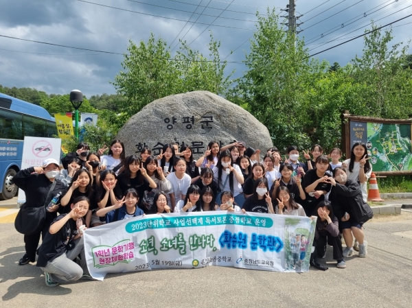 [충청뉴스큐] 온양한올중학교은 19일 2023 단위학교 사업선택제 독서토론 중점학교 운영의 일환으로 ‘소년, 소녀를 만나다’의 주제를 가지고 경기도 양평에 소재한 황순원 문학관으로 1학년 학생들과 사제동행 문학기행을 떠났다.