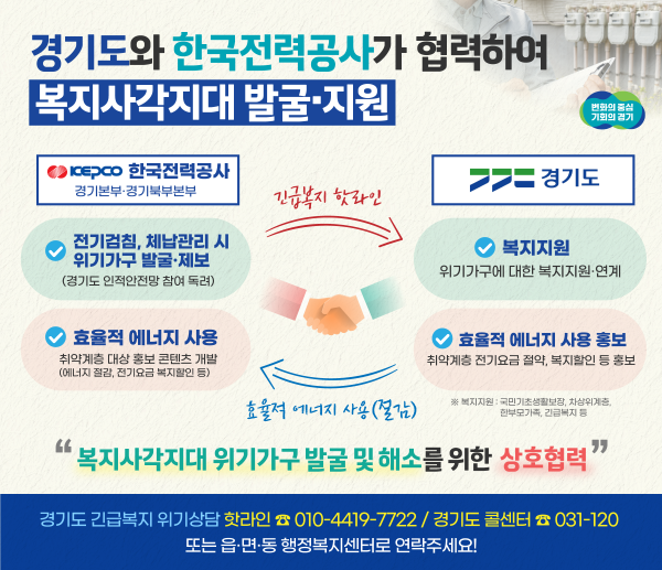 복지 사각지대 발굴 연계 외에도 한국전력공사 경기본부·경기북부본부는 경기도와 함께 경제적 어려움을 겪는 취약계층을 대상으로 효율적인 에너지 사용과 전기요금 복지 할인제도 신청을 통한 전기요금 부담 완화 등의 내용을 적극 홍보한다.