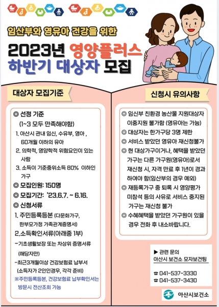 [충청뉴스큐] 아산시는 영양측면의 위험 집단인 임산부와 영유아의 불균형 개선을 위한 2023년 하반기 영양플러스사업 신규 대상자를 모집한다.
