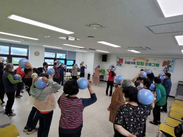 이번 프로그램은 2회로 운영되며 짐볼을 이용해 신체와 손의 협응력을 강화하는 건강체조와 단체 게임으로 단어를 몸으로 표현하기, 발 볼링 등 신체를 활용한 동작으로 구성됐으며 치매환자와 가족이 함께 게임을 하는 과정을 통해 자연스럽게 스트레스를 해소하고 웃음을 유발함으로써 기분전환이 되는 시간을 제공했다.