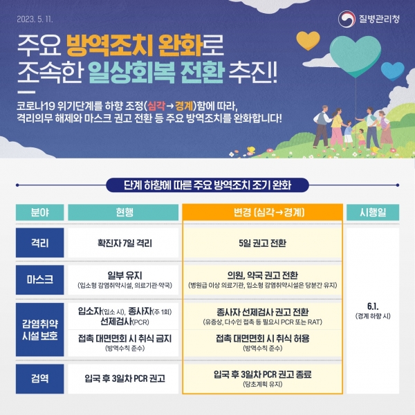 6월 1일을 기점으로 코로나19 위기 경보 수준이 ‘심각’에서 ‘경계’로 하향 조정되면, 우선 확진자에게 부과되던 7일간의 격리 의무가 5일 권고로 전환되고 실내 마스크 착용 또한 의원, 약국에서는 전면 권고로 전환하나, 환자들이 밀집해있는 병원급 이상 의료기관과 입소형 감염 취약 시설은 당분간 착용 의무를 유지한다.
