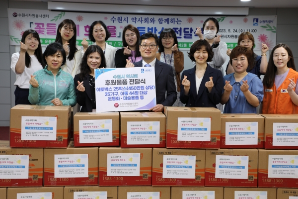 수원시약사회와 수원시자원봉사센터는 24일 자원봉사센터 4층 대강당에서 ‘꽃들에게 희망을’ 후원물품 전달식을 열고 구운동·우만2동·율천동·인계동·화서2동 행정복지센터에 각각 ‘아토박스’ 5박스를 전달했다.