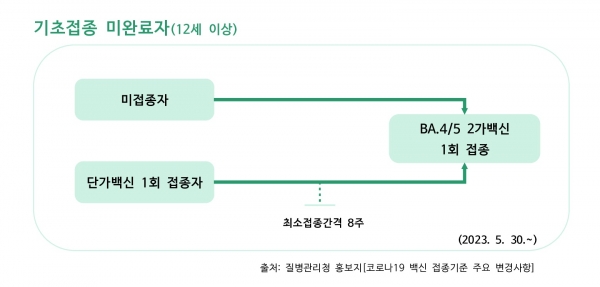 접종대상은 12세 이상 기초 접종 미접종자로 이전 단가 백신 접종여부 및 횟수와 관계없이 2가 백신 1회 접종으로 기초접종이 가능하다.