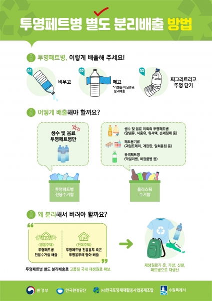 수원시 관계자는 “생수·음료 투명페트병은 이물질 함량이 낮고 순도가 높아 고품질로 재활용할 수 있다”며 “순환경제 활성화를 위해 전 시민이 투명페트병 분리배출에 적극적으로 동참해 주시기를 바란다”고 말했다.