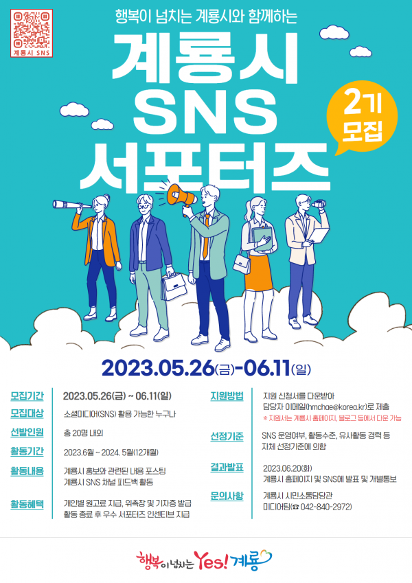 시 관계자는 "최근 홍보의 주요 수단으로 자리 잡은 SNS를 통해 계룡시의 숨은 매력을 널리 알리게 될 제2기 SNS 서포터즈에 재능있는 분들의 많은 지원을 바란다"고 말했다.