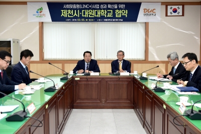 [충청뉴스큐] 대원대학교와 제천시는 지난 5일 오후 4시 대원대학교 총장실에서 사회맞춤형 산학협력 선도전문대학 육성사업 성과확산을 위한 업무협약식을 가졌다.
