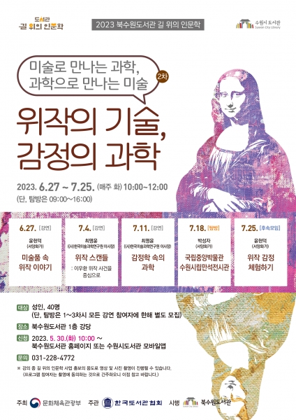 [충청뉴스큐] 수원시 북수원도서관이 2023년 길 위의 인문학 ‘미술로 만나는 과학, 과학으로 만나는 미술 : 2차 위작의 기술, 감정의 과학’ 수강생 40명을 선착순으로 모집한다.