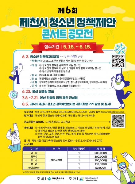 [충청뉴스큐] 제천시가 제천시청소년센터 주관으로 ‘제6회 제천시 청소년 정책제안콘서트 공모전’을 진행하고 오는 15일까지 제안을 공모한다.